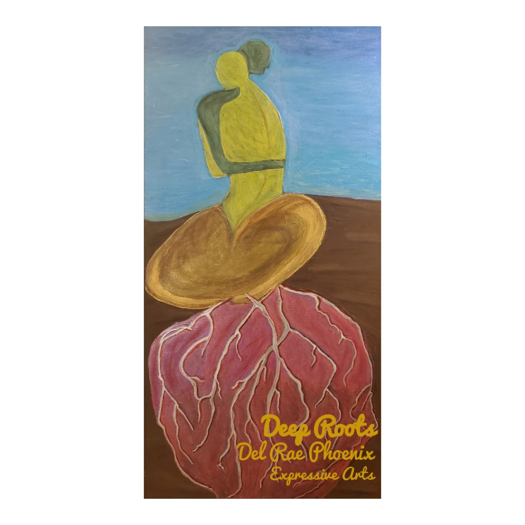 Beltane is the midpoint between the Winter Solstice and Spring Equinox, when we begin to see the first indications of Spring, with bulbs sprouting and new litters of many species of animals being born. In keeping with the theme of personal growth, the painting Sprout represents the new growth that stems from the seeds of wisdom that are planted in the deep reflection of the winter months, with the roots growing into veins and arteries that feed and circulate love. The painting Deep Roots is a continuation of this theme, with a fully realized person growing from the sprout and embracing their shadow side as a reflection of loving the whole self.