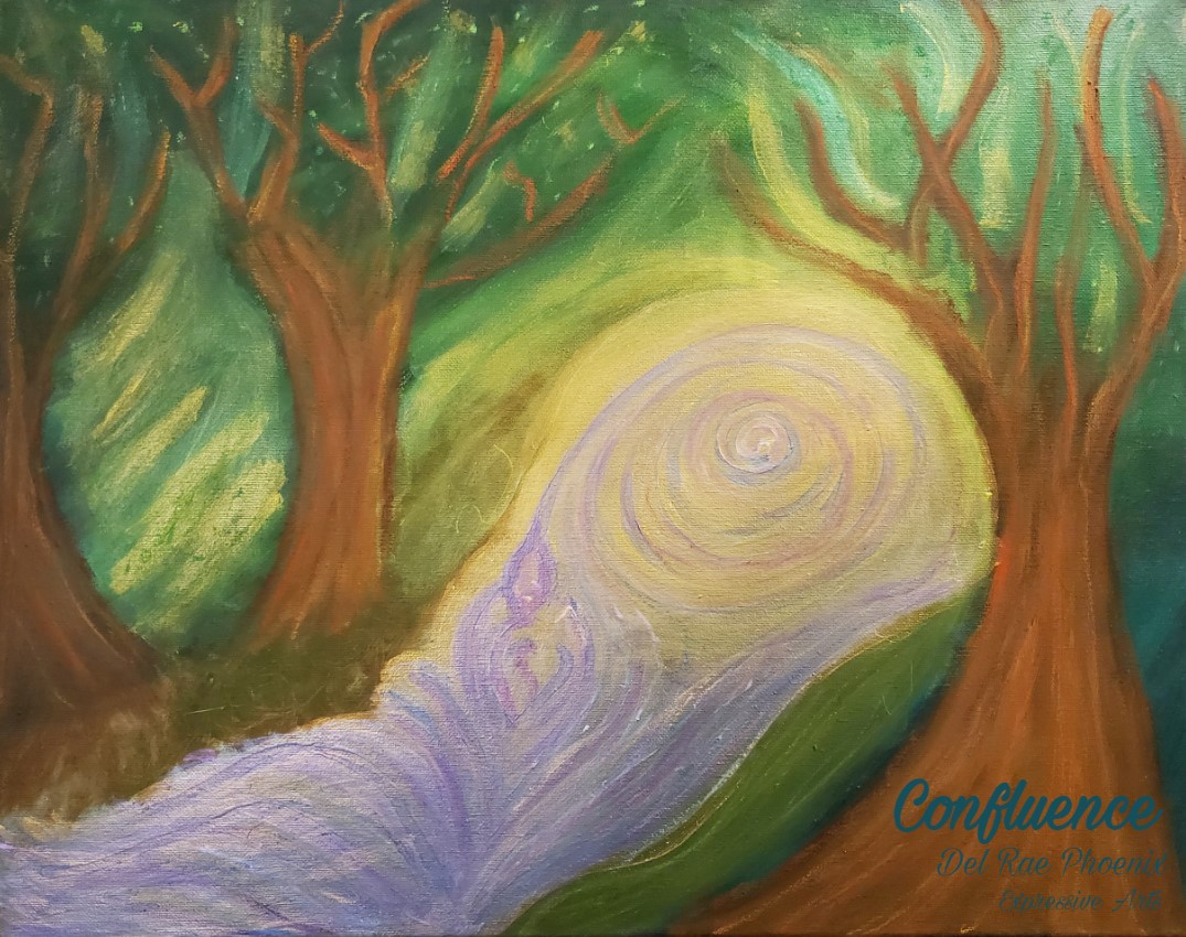 Confluence depicts a dark forest representing life struggles, with several strands of light representing experiences that lay the foundations of wisdom. These strands of light flow into a vortex before taking an ambiguous shape which then flows into a stream of consciousness that continues on through the forest.