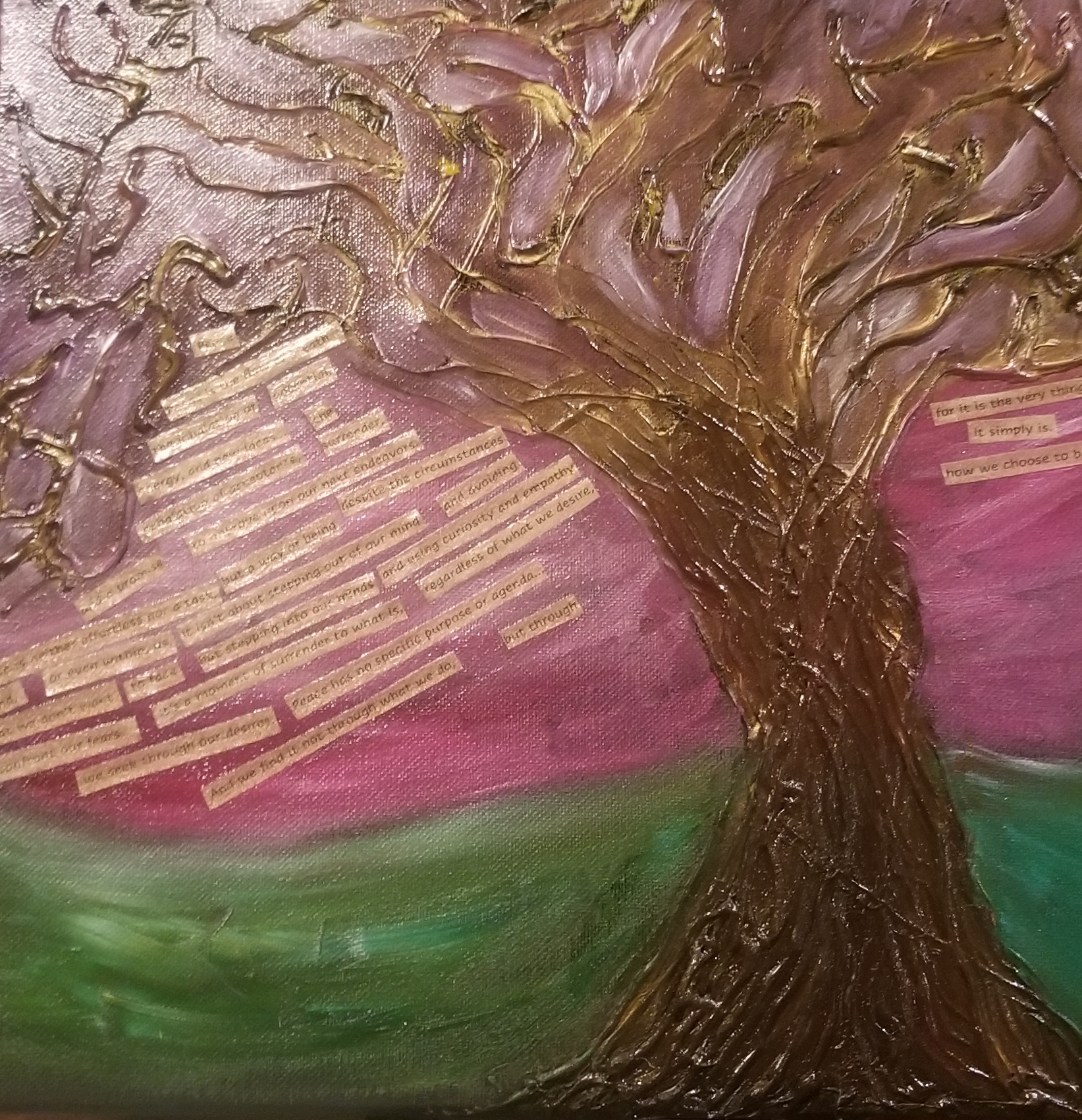 Mixed media collage with poetry series. Poetree at Dawn and Poetree at Dusk Poems available in Musings here. Swirled Thoughts Poems available in Musings here. Piece sold.